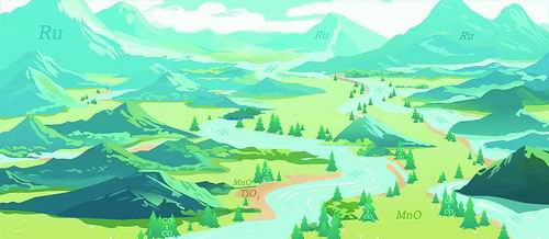 于是,劉岳峰和康輝找設(shè)計師畫了一幅中國風(fēng)的三江源“山水畫”,通過它來描述催化劑作用原理。釕基催化劑就是一座座高山,“氫溢流”就是山腰上蜿蜒而下的河流,暢通無阻的河道中流淌的是氫,河道旁的平原就是氧化鈦-氧化錳,在河流灌溉下長出樹木,氫氣成為養(yǎng)分,一氧化碳就是果實(shí)。