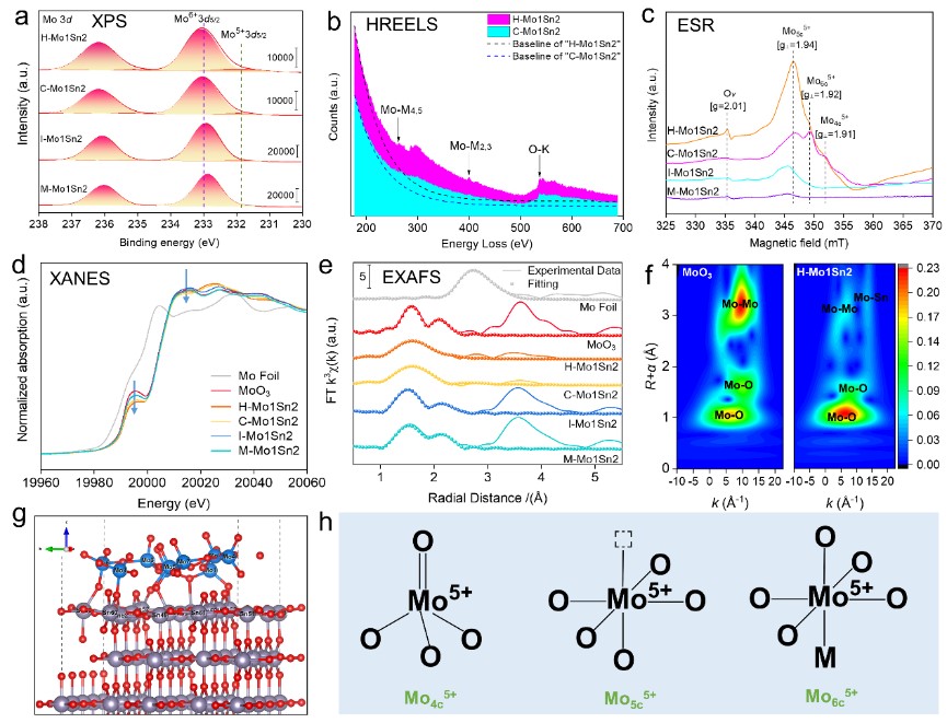 Mo物種的電子狀態和配位結構是影響催化活性的關鍵(圖2)。研究團隊通過對催化劑的深度表征(低溫 ESR、(quasi in-situ)XPS、(in-situ)XAFS、AC HAADF 等),發現新鮮H-Mo1Sn2催化劑存在較多的Mo5+,并且在反應過程中存在Mo6+向Mo5+的轉變,反應前后Mo5+主要以不飽和五配位的五價鉬(Mo5c5+) 結構存在,通過進一步設計實驗,確證了活性中心Mo5+5c 可在反應中原位生成,并且Mo中心原子高度配位不飽和(第一殼層總配位數為4.4)且Mo-O鍵鍵長明顯縮短。