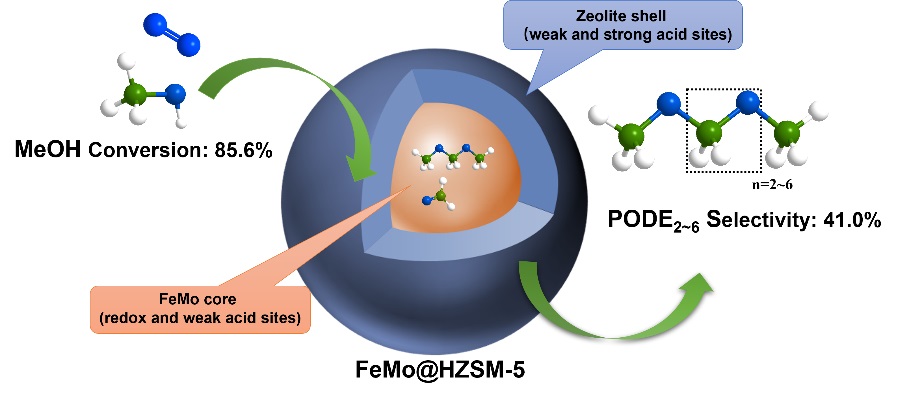 中國科學院山西煤炭化學研究所張清德研究員團隊,在前期研究二甲醚氧化合成PODEn的基礎上,基于目標反應的特點,設計、調控了不同強度酸性位和氧化還原活性位距離及分布,構建了活性位高度協(xié)同的ZSM-5包覆MoFe的核殼催化劑,實現了甲醇氧化一步合成更長C-O鏈PODEn重要突破性進展,PODE2-6的選擇性達41.0%(圖1)。該成果近日以“Direct Oxidation of Methanol to Polyoxymethylene Dimethyl Ethers over FeMo@HZSM-5 Core-Shell Catalyst”為題發(fā)表在ACS Catalysis (ACS Catalysis, 2024, 14: 1093-1097) 期刊上,并被選為封面文章(圖2)。