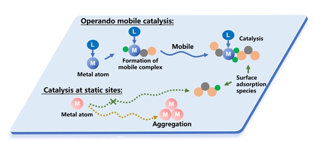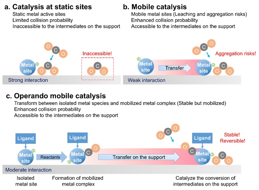 移動(dòng)催化概念的提出旨在解決高分散催化劑在苛刻環(huán)境容易團(tuán)聚、不能轉(zhuǎn)化載體表面吸附物種等難題,通過(guò)構(gòu)筑真實(shí)反應(yīng)條件下可在載體上可逆鍵合和遷移、催化的金屬活性中心,提升金屬中心和反應(yīng)分子或中間體的碰撞幾率進(jìn)而提升反應(yīng)效率。