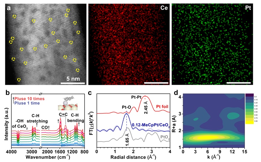 為構(gòu)筑這種可逆鍵合物種,作者發(fā)展出一種多重脈沖氣相吸附策略,即使用原子層沉積技術(shù)前驅(qū)體MeCpPtMe3與CeO2載體發(fā)生多次半反應(yīng),構(gòu)筑配位結(jié)構(gòu)相同,但覆蓋度不同的MeCpPt-CeO2催化劑。通過(guò)自主設(shè)計(jì)建設(shè)的原子層沉積-紅外-質(zhì)譜聯(lián)用系統(tǒng),實(shí)時(shí)觀測(cè)Pt前驅(qū)體與CeO2表面之間的化學(xué)反應(yīng),并結(jié)合多種手段確認(rèn)了MeCpPt-分子片段在CeO2上的落位情況和配位結(jié)構(gòu)。