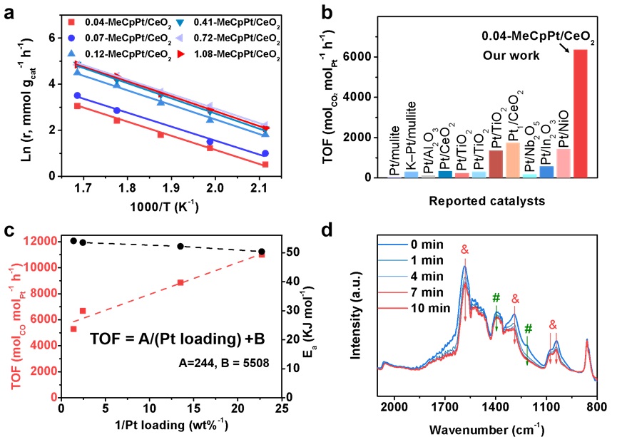 在逆水煤氣反應(yīng)中,該催化劑不僅呈現(xiàn)出極高的TOF值,還產(chǎn)生了反常的TOF-負(fù)載量相關(guān)性,即相近表觀活化能下,具有相近初始配位結(jié)構(gòu)的Pt分子片段的本征活性隨Pt原子覆蓋度的降低而明顯提高。