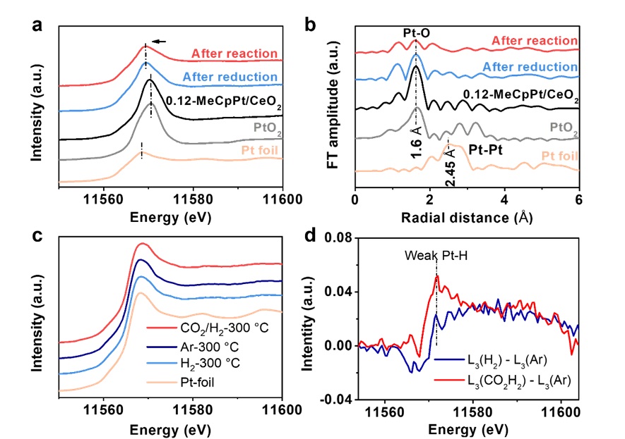 為探究反應(yīng)機(jī)制,作者利用準(zhǔn)原位XPS、原位XAFS、原位紅外觀察催化劑在反應(yīng)過(guò)程中的催化機(jī)制和結(jié)構(gòu)演變,證實(shí)了MeCpPt-O-Ce在原位條件下發(fā)生Pt-O鍵的斷鍵,以及Pt-CO和Pt-H配位的形成。
