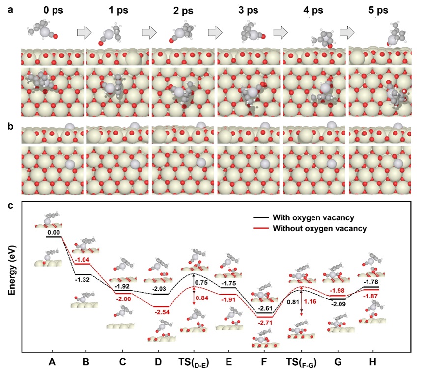 進(jìn)一步結(jié)合DFT和從頭算分子動(dòng)力學(xué)模擬,揭示了在原位反應(yīng)中MeCpPt分子片段與H和CO配位生成MeCpPt(H)CO可移動(dòng)分子,能夠在皮秒尺度沿CeO2表面遷移而不脫落和團(tuán)聚,并移動(dòng)到碳酸鹽中間體上并實(shí)現(xiàn)其高效催化轉(zhuǎn)化的機(jī)理。