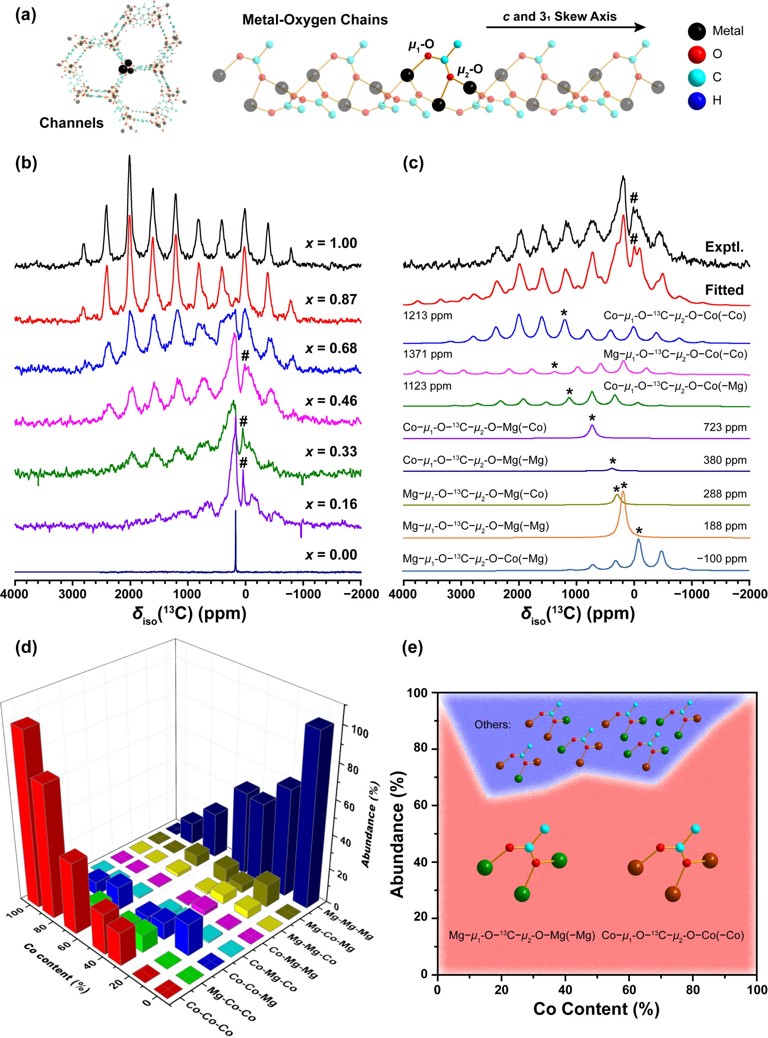在多相催化過程中,金屬位點對原料和中間體的吸脫附是決定催化性能的關鍵因素。為探究金屬原子排布序列影響金屬位點吸附性能的微觀機制,中國科學院山西煤炭化學研究所何鵬研究員團隊與南開大學和中國科學院青海鹽湖所的科研團隊合作,使用13C固體核磁共振解析了含有一維金屬—氧鏈的混合金屬MOF-74材料中Mg2+離子和Co2+離子在原子尺度上的排列狀況,并建立了上述原子尺度結構信息與宏觀氣體吸附性能之間的聯系,相關研究成果在《美國科學院會志》(PNAS 2024 ,121(6) ,e2312959121)上發表。