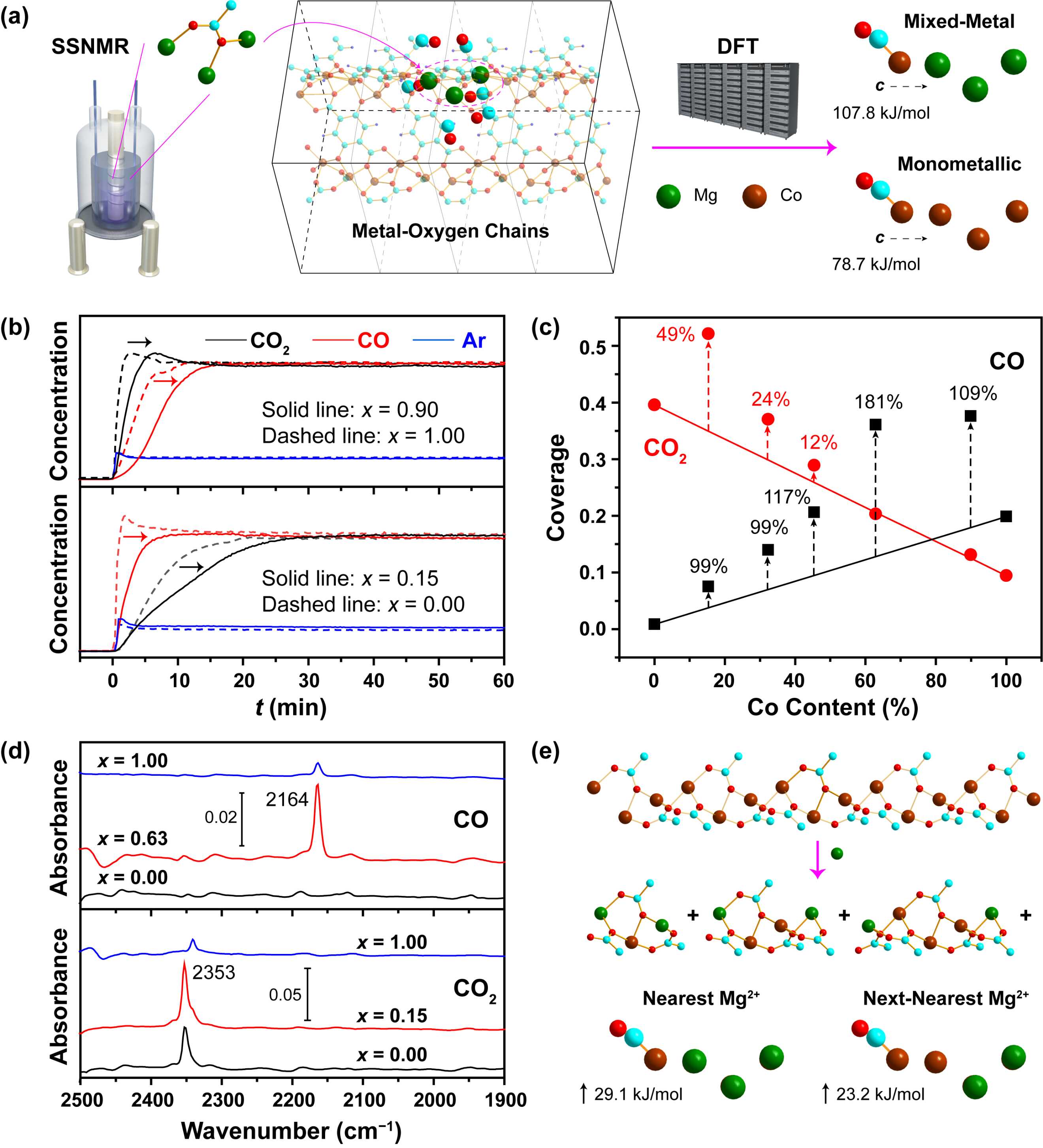 在本工作中,研究團隊利用在前期工作(Sci. Adv.?2022 ,8 ,eadd5503)中開發的13C固體核磁共振技術,以13C選擇性標記Mg/Co-MOF-74材料中有機配體的羧基,將其作為探針直接檢測Mg2+和Co2+離子在原子尺度(納米)上的排列。作者結合超高速魔角旋轉技術和變偏移量譜圖收集方法下獲取了不同組成下Mg/Co-MOF-74材料的高質量超寬13C固體核磁譜圖,發現譜圖隨宏觀金屬組成的變化而呈現出有規律的變化,分峰擬合后再通過確認Co2+離子之間的磁耦合方式、分析Co2+離子與羧基碳之間的距離和鍵角以及開展密度泛函理論計算指認了所有八組特征13C核磁峰所對應的離子排列。作者隨后進行的定量分析表明與晶體結構相同的Mg/Ni-MOF-74材料相比,Mg/Co-MOF-74中Mg2+和Co2+在原子尺度上的混合程度并不高,主要在金屬—氧鏈中形成含有三個同種離子或更多同種離子的團簇??紤]到Ni2+和Co2+的離子半徑及在MOF框架中的配位環境完全相同,這種現象說明兩種離子在自旋狀態(Ni2+為S=1,Co2+為S=3/2)上的差別可能與其在原子尺度上和Mg2+的混合能力有關。作者進一步使用13C固體核磁共振實驗中揭示的原子尺度金屬離子排列信息建立一系列結構模型,再通過密度泛函理論計算預測混合金屬MOF的氣體吸附性能。計算結果表明無論在單一金屬MOF和混合金屬MOF中,氣體分子都優先吸附在強吸附位點(CO:Co2+;CO2:Mg2+)上。然而,當在Co-MOF-74中摻入Mg2+或在Mg-MOF-74中摻入Co2+后,弱吸附位點的進入反而導致強吸附位點上的氣體吸附能增加,并且Mg2+對CO在Co2+上的吸附增強效應不是局域的,即金屬—氧鏈內非最鄰近的Co2+也會受到顯著影響,而Co2+對CO2在Mg2+上的吸附增強效應僅對金屬—氧鏈內最鄰近的Mg2+有效。因此,作者認為混合金屬Mg/Co-MOF-74的CO或CO2吸附性能應優于單一金屬MOF-74,同時CO的吸附增強更為顯著,并且在很寬的組成范圍內都能觀測到吸附增強。在低分壓下開展的CO/CO2動態穿刺實驗結果及原位紅外表征結果與上述分析結果高度吻合。在本工作中獲得的成果表明,作者發展的基于固體核磁共振研究混合金屬MOF的方法通過提供其他手段所無法獲得的原子尺度結構信息,闡明原子排布序列對金屬位點上不同類型吸附作用造成的差異化影響,有望為催化位點的理性設計提供依據。?