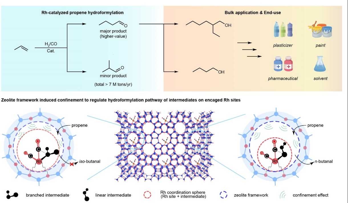 近日,中國(guó)科學(xué)院山西煤炭化學(xué)研究所曹直研究員團(tuán)隊(duì)與中科合成油技術(shù)股份有限公司團(tuán)隊(duì)在該研究方向取得了突破性進(jìn)展,利用多相“銠-分子篩”負(fù)載型催化體系,首次實(shí)現(xiàn)了丙烯氫甲酰化以超高區(qū)域選擇性制取出正丁醛。該團(tuán)隊(duì)將經(jīng)典的分子篩骨架對(duì)反應(yīng)中間體的“擇形效應(yīng)”拓展應(yīng)用至分子篩骨架與結(jié)構(gòu)清晰的銠活性位點(diǎn)之間形成的狹小限域空間,通過(guò)抑制在氫甲酰化反應(yīng)中生成具有較大空間位阻的異丁醛中間體,實(shí)現(xiàn)了對(duì)目標(biāo)產(chǎn)物正丁醛超過(guò)99%的區(qū)域選擇性,同時(shí)醛類產(chǎn)物總選擇性也高于99%,催化劑轉(zhuǎn)化頻率超過(guò)6500 h-1。上述催化性能結(jié)果超越了迄今為止報(bào)道的所有多相催化劑和幾乎所有的均相催化劑。該研究不僅為如何通過(guò)多相催化的方法選擇性獲取熱力學(xué)上更不穩(wěn)定的反馬式加成產(chǎn)物——正丁醛提供了一種新方法,也進(jìn)一步拓展了經(jīng)典分子篩骨架“擇形催化”這一概念,也為目前丙烯氫甲酰化工業(yè)生產(chǎn)中存在的巨大挑戰(zhàn)提供了新的解決思路與方法。