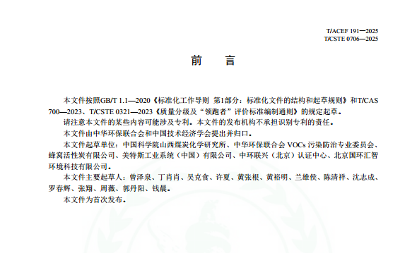 日前,由中華環保聯合會和中國技術經濟學會提出并歸口,山西煤化所309課題組牽頭編制的《質量分級及“領跑者”評價要求 活性炭吸脫附裝置專用蜂窩活性炭》(T/ACEF 191—2025、T/CSTE 0706—2025)團體標準(簡稱“領跑者”評價標準)正式在全國團體標準信息平臺發布,并于2025年3月12日起開始實施。