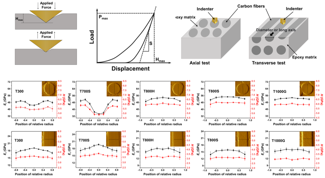本研究創新性地提出了一種基于納米壓痕技術表征碳纖維微觀結構的新方法,彌補了碳纖維微觀力學性能徑向分布研究的空缺。