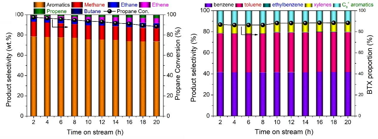 Ga-MH-ZSM-5催化劑在丙烷芳構(gòu)化反應(yīng)中表現(xiàn)出優(yōu)異的性能。丙烷轉(zhuǎn)化率和芳烴選擇性分別高達(dá)97.4%和78.2wt%,其中,輕質(zhì)芳烴(BTX)占比高達(dá)88%。