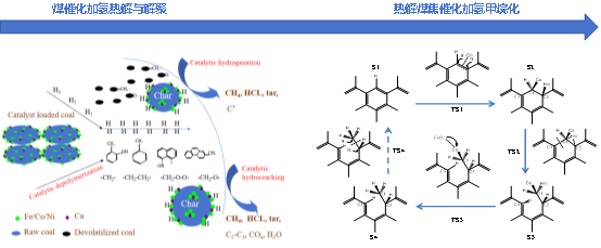 催化劑在煤加氫熱解以及熱解煤焦加氫甲烷化過程作用原理示意圖