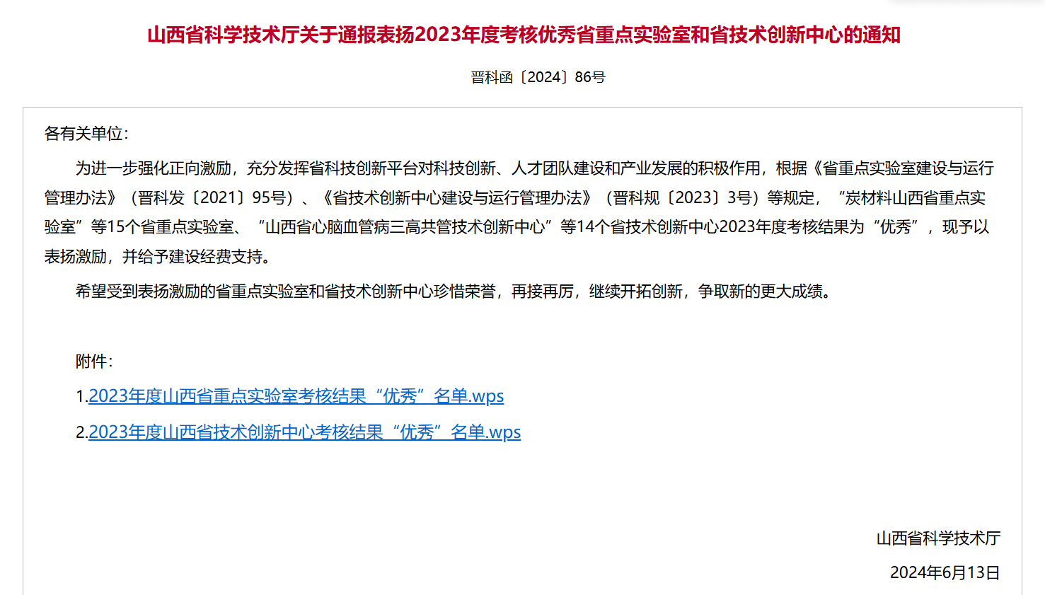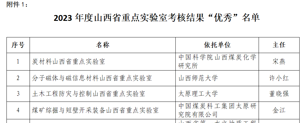 山西省科技廳為進一步強化正向激勵,充分發揮省科技創新平臺對科技創新、人才團隊建設和產業發展的積極作用,根據《省重點實驗室建設與運行管理辦法》(晉科發〔2021〕95號)等規定,對省重點實驗室進行年度考核,炭材料山西省重點實驗室2023年度考核被評定為“優秀”,山西省科技廳予以表揚激勵,并給予建設經費支持。這是炭室連續第四年(2020、2021、2022、2023年度)考核被評為優秀。