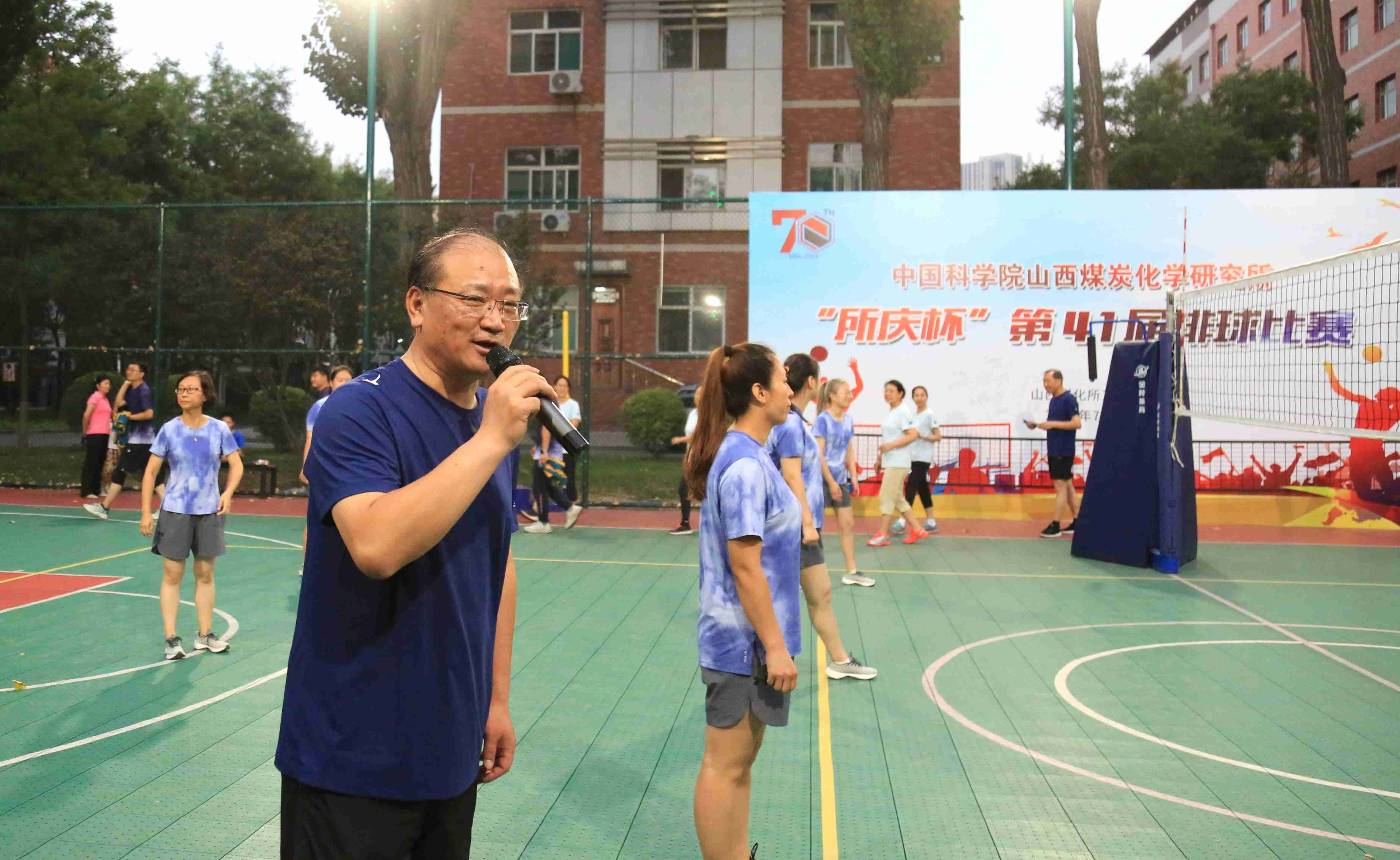 揭幕戰上,所長房倚天攜帶老隊員與排球協會年輕隊員進行表演賽,并宣布比賽正式開始。