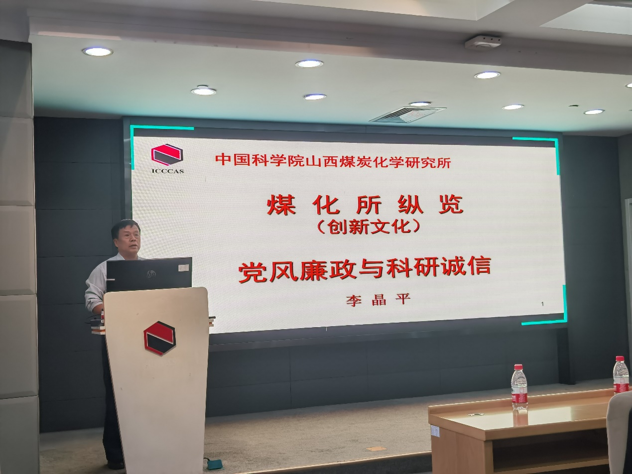 李晶平就山西煤化所歷史沿革、創新文化、黨風廉政與科研誠信等方面作了專題報告。他指出,自1954年10月中國科學院煤炭研究室以來,山西煤化所在廣大職工七十年的共同努力下,不斷開拓進取,取得了豐碩的科研成果。希望新職工、新生要傳承山西煤化所精神,“敢為前人之所不為,敢為同類之所不為”,牢記我們是“國家人”、“國家隊”,必須心系“國家事”、肩扛“國家責”。要求大家要對黨紀國法心懷敬畏,要堅守科研道德,勇于創新;要遵守科研誠信,堅決抵制科研中弄虛作假行為。要牢記研究所的歷史,傳承科學家精神,將自身愛好同國家、研究所的發展緊密結合起來,發揮好國家戰略科技力量主力軍作用。
